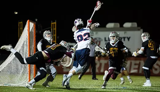 Hosting its second top-10 opponent in as many nights, Liberty University's 19th-ranked MCLA Division I men's lacrosse team opened a 7-6 lead on No. 10 Arizona State before the intermission and eventually emerged with a 12-11 triumph, Saturday night at the Liberty Lacrosse Fields .
