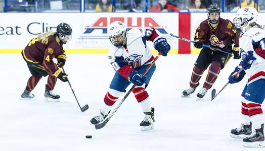Then, with 8:48 left in the second, graduate forward Shelby Bradford sent a touch pass to DeMerchant at the top of the right circle and she skated in and lifted a beautiful wrist shot into the upper netting for a commanding 7-0 edge.