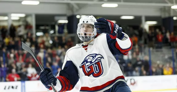 Liberty’s special teams were so effective that they were even a threat on the penalty kill, generating two shorthanded opportunities early in the second period. Ottenbreit started them both with breakaway steals, setting up sophomore forward DJ Schwenke, who was denied by Benedetto on the first, before finishing the second with a beautiful backhand inside the right post after a spectacular move, lifting the Flames to a 4-1 advantage with 17:03 to go.