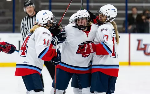 In Friday’s first game against the Profs, sophomore forward Camille Sponaugle started the scoring at the 13:54 mark off an assist from freshman center Isabel Crossman before Rowan tied the contest exactly two minutes later. Less than a minute and a half after that, with Liberty on the power play, freshman forward Guinivere Donovan tracked down freshman defenseman Emma Wallace’s shot that trickled through the right crease and gave the Lady Flames the lead for good by skating from behind the Profs’ net and slipping a shot inside the right post.