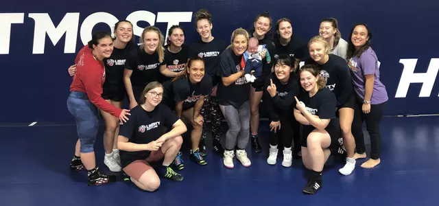 She enlisted her younger sister, Assistant Coach Cendall (Manley) Murphy, who matched Castro (’81) as Liberty's only four-time national champions, to demonstrate most of the moves on the mat while she talked her wrestlers through them.