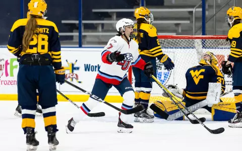 West Virginia struck again to trim the deficit to 4-2 with 7:45 remaining in regulation, but just over a minute and a half later, sophomore right wing Piper Prem picked up a loose puck behind the net and sneaked a backhand past Herman inside the right post.