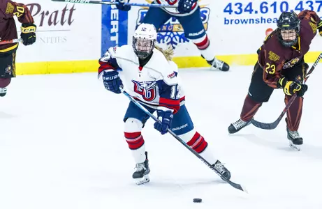 "The girls played a pretty good 60 minutes of hockey," Liberty Head Coach Chris Lowes said after his team improved to 15-0 and extended its ACHA-record winning streak to 55 games. "First period, I liked our energy, especially on the road on one of our longer trips. The second period was a special teams battle, and the third was a bit of a mess. They got a couple goals by capitalizing on our breakdowns. Overall, it was a good result for us and I like the matchup for us."