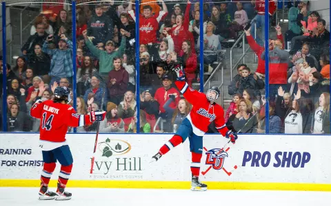 A defensive duel with plenty of physicality and a chess match in offensive strategies was on display between Liberty University’s No. 3-ranked ACHA Division I men’s hockey team and No. 11 Jamestown (N.D.) on Friday night at the LaHaye Ice Center, where the Flames emerged with a 2-1 triumph — their third in a row against the Jimmies, all this season.