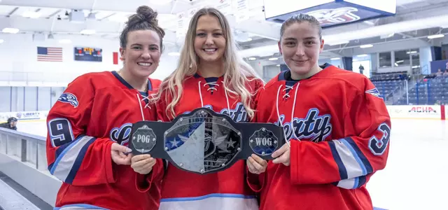 “There’s a lot to celebrate,” said Lowes, who improved to 132-8-3 in five seasons at the helm after coaching Liberty’s ACHA DII men’s team for the previous 10. “Obviously, we had pretty strong performances and some good execution both days. Special teams play was big this weekend. Our penalty kill has had a pretty incredible year. We’ve only given up one or two goals on the PK all year. And this was our first perfect season, too, the first time we’ve been able to run the gamut.”