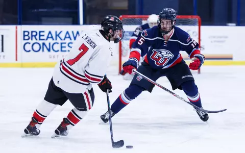 In the opener, Liberty got goals from five different scorers, sparked by graduate defenseman Alex Norwinski’s shot set up by sophomore wing David Hauke and freshman defenseman Connor Diem at the 13:02 mark. Rowan tied it up with 3:48 left in the first period before seizing a 2-1 lead at the 13:48 mark of the second, but the Flames would score the next four goals — the first by junior forward Cooper Neal just 43 seconds later — to take command.
