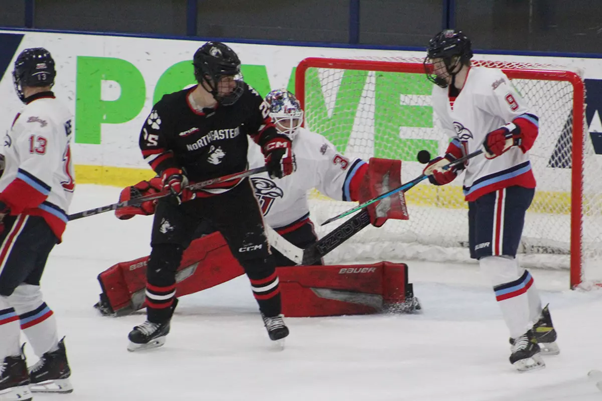 Flames freshman defenseman Theo Priem extended the lead to 3-1 by jumping into an odd-man rush and recovering a rebound of another shot by Martin before putting away a driving score. Northeastern tied the contest by netting the only two goals of the third period.