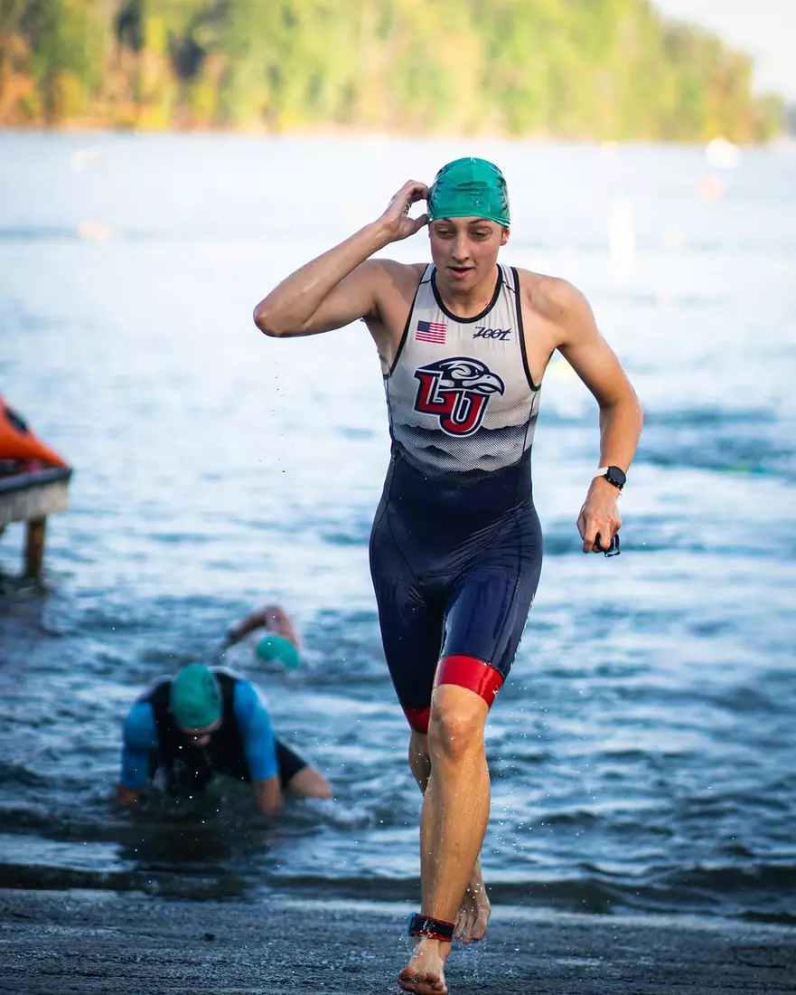 She finished fifth among Liberty's triathletes, behind the Flames' top four men — sophomore Alex Schimmel (2:06:54.33), junior Brandon Schimmel (2:11:00.15), freshman Evan Bittner (2:14:57.26), and freshman Ben Babcock (2:25:19.25). Freshman Jack Donohue rounded out the Flames' top five in 2:30:05.69, after sophomore Gabe Shreve, a regular in the top three, did not finish.